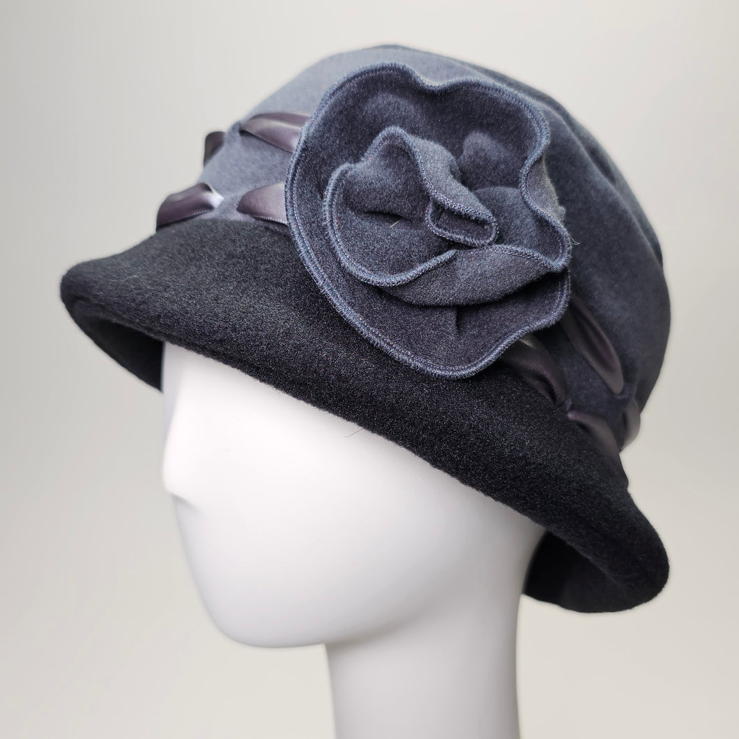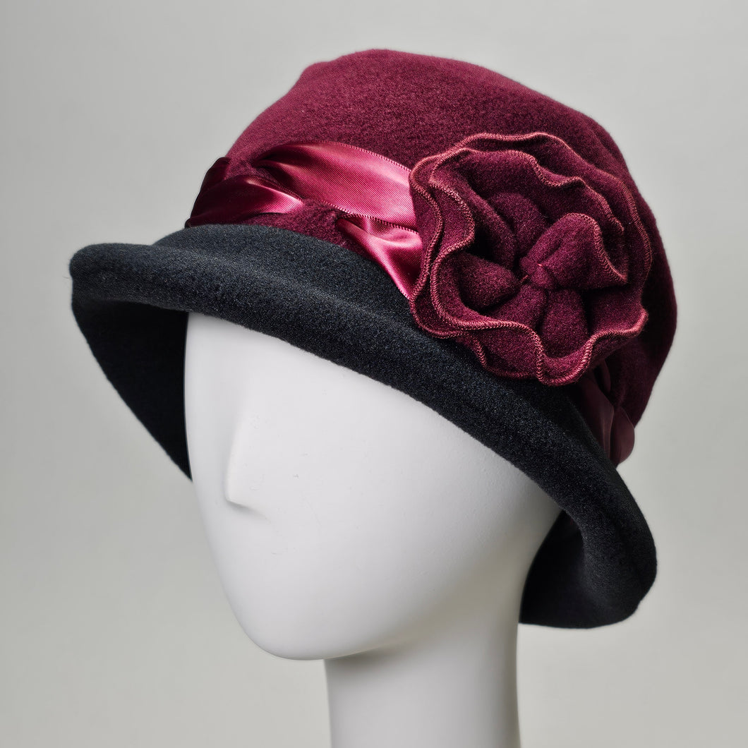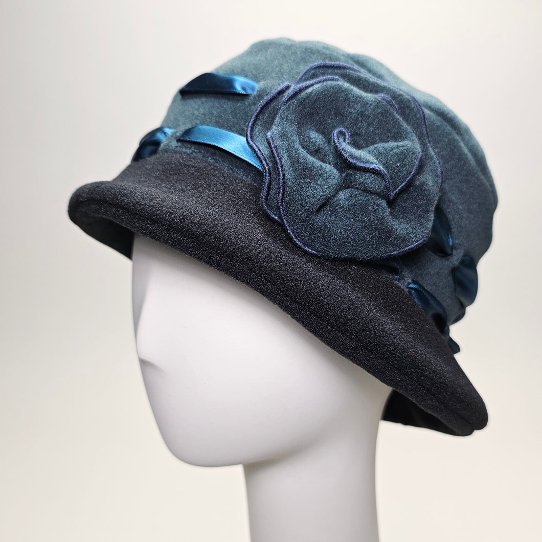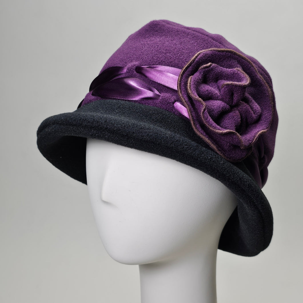 For the perfect 1920’s cloche, the Rose hat exceeds all expectations. Made with hi-tech fabric it is a perfect blend of style and comfort. Rose detail in polar fleece with satin ribbon stitching around the crown, still remain washable yet dress up the matte polar fleece.