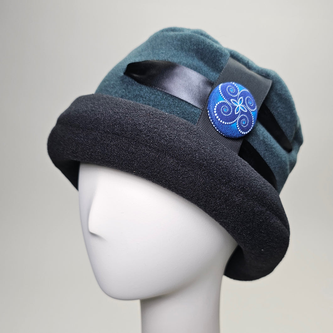 The Sandra hat has a turned up brim, black grosgrain and satin ribbon. It has a handmade button made with Schwe Schwe fabric brought back from Cape Town, South African on my sabbatical trip. Made with hi-tech fabric it is a perfect blend of style and comfort. It has a nice structure to it and a compact shape. This hat looks great with a wide variety of hair lengths and is close around the ears even before you pull the earflaps down.