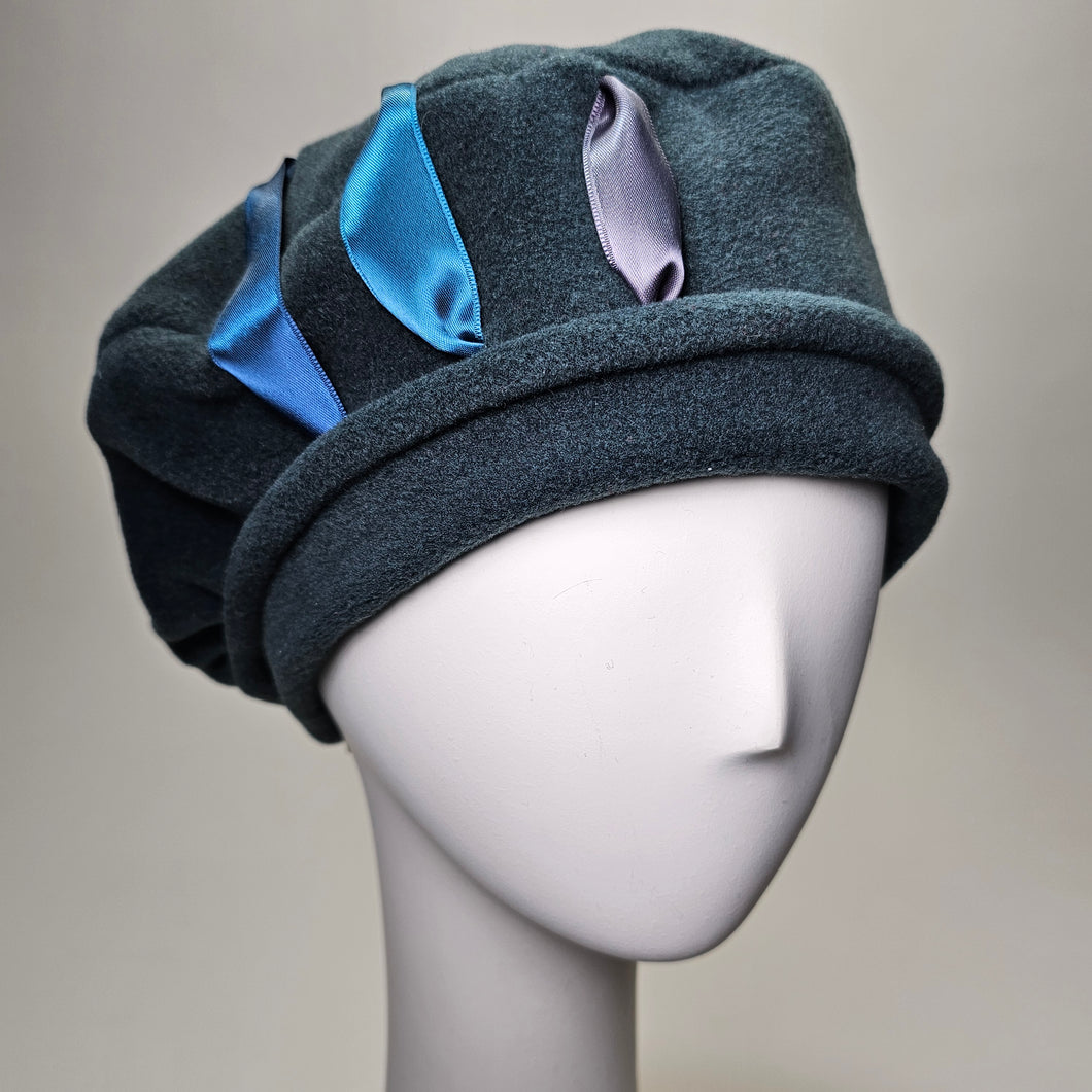 The Sutton hat is a lined medium beret in polar fleece with 3 colors of ribbon gracing the side.. It folds gently over to the side and pulling down the inner band gives you more coverage on the colder days. Good for larger heads, this hat is soft and romantic. The roomy fit is easy on your hair.